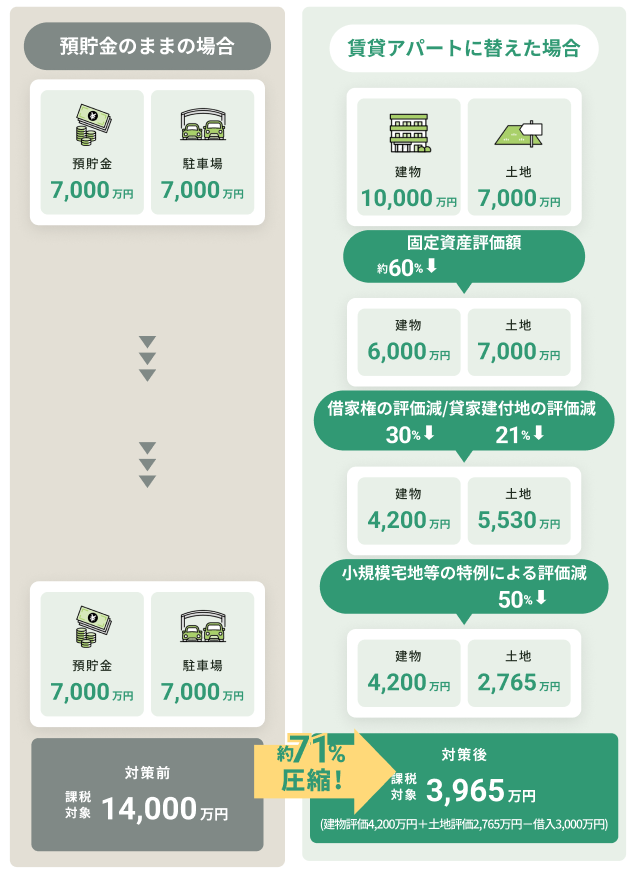 預貯金7,000万円の相続税評価は7,000万円のままですが、賃貸アパートあるいは賃貸マンションに替えれば、預貯金7,000万円の評価を40%近くにまで下げることが可能となります。さらに、一部を金融機関からの「借入」にすることで相続税評価からマイナスにできるケースもございます。