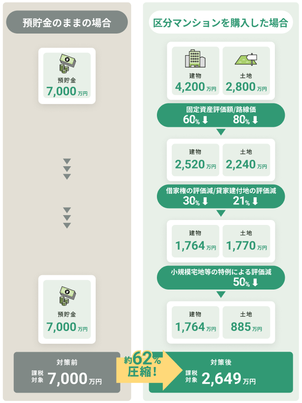 預貯金7,000万円の相続税評価は7,000万円のままですが、区分マンションを購入することで、預貯金7,000万円の評価を40%近くにまで下げることが可能となります。