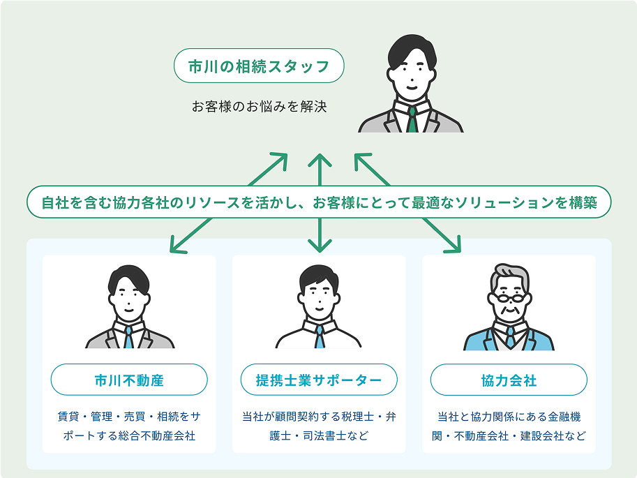 当社では、会社設立前から10年以上にわたる付き合いがあり、不動産への知見も深い税理士・司法書士・弁護士と顧問契約を結んでおります。難解で複雑な相続問題に対して、チーム市川の総合力で立ち向かいます。