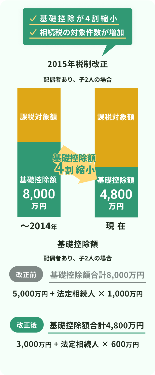従前では8,000万円までの課税財産まで相続税が発生することはありませんでしたが、基礎控除が4,800万円に引き下げられたことにより、相続税の課税件数が増加しました。