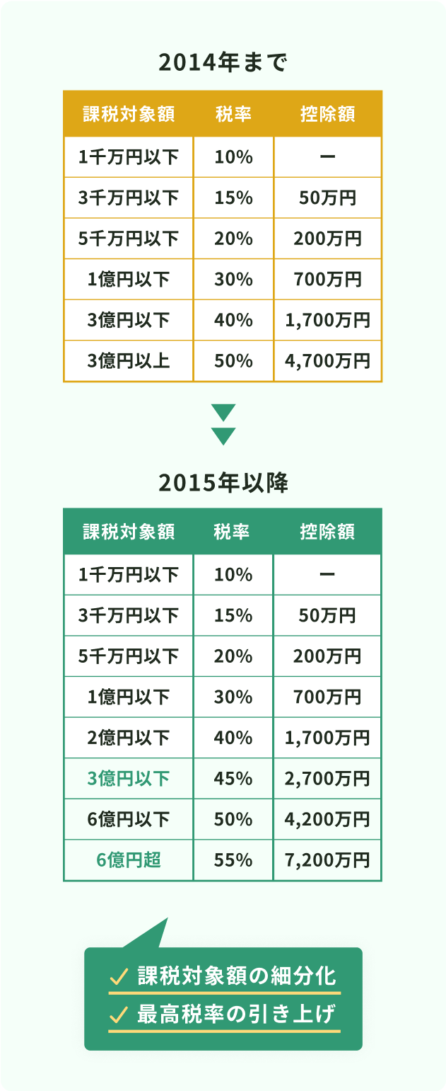 相続税の税率区分が6段階から8段階に増え、計算が複雑化しました。課税価格に応じて10%から55%までの8段階の税率が適用されます。また、最高税率が50%から55%に引き上げられました。